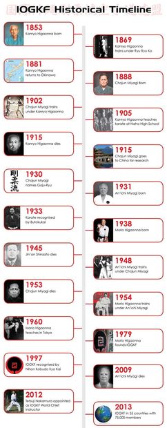 The history of Goju-ryu dates back hundreds of years and finds it's origins in the Shaolin Temples of Southern China. This page includes both a basic timeline of the significant events in the history of our style of Karate and also the legendary story of our style in greater detail.